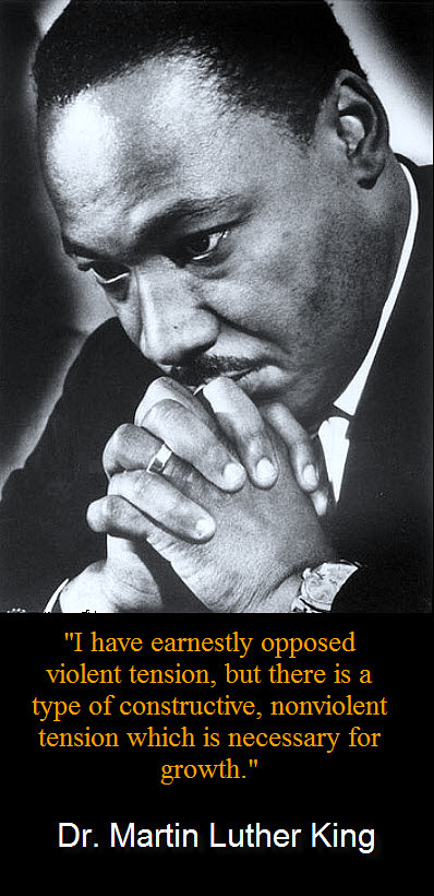 “The purpose of our direct action program is to create a situation so crisis-packed that it will inevitably open the door to negotiation. . . . Indeed, this is the very purpose of direct action. . . . It seeks so to dramatize the issue that it can no longer be ignored. . . . My citing the creation of tension as part of the work of the nonviolent resister may sound rather shocking. But I must confess that I am not afraid of the word ‘tension.’ I have earnestly opposed violent tension, but there is a type of constructive, nonviolent tension which is necessary for growth” (M.L. King, Letter from the Birmingham Jail).